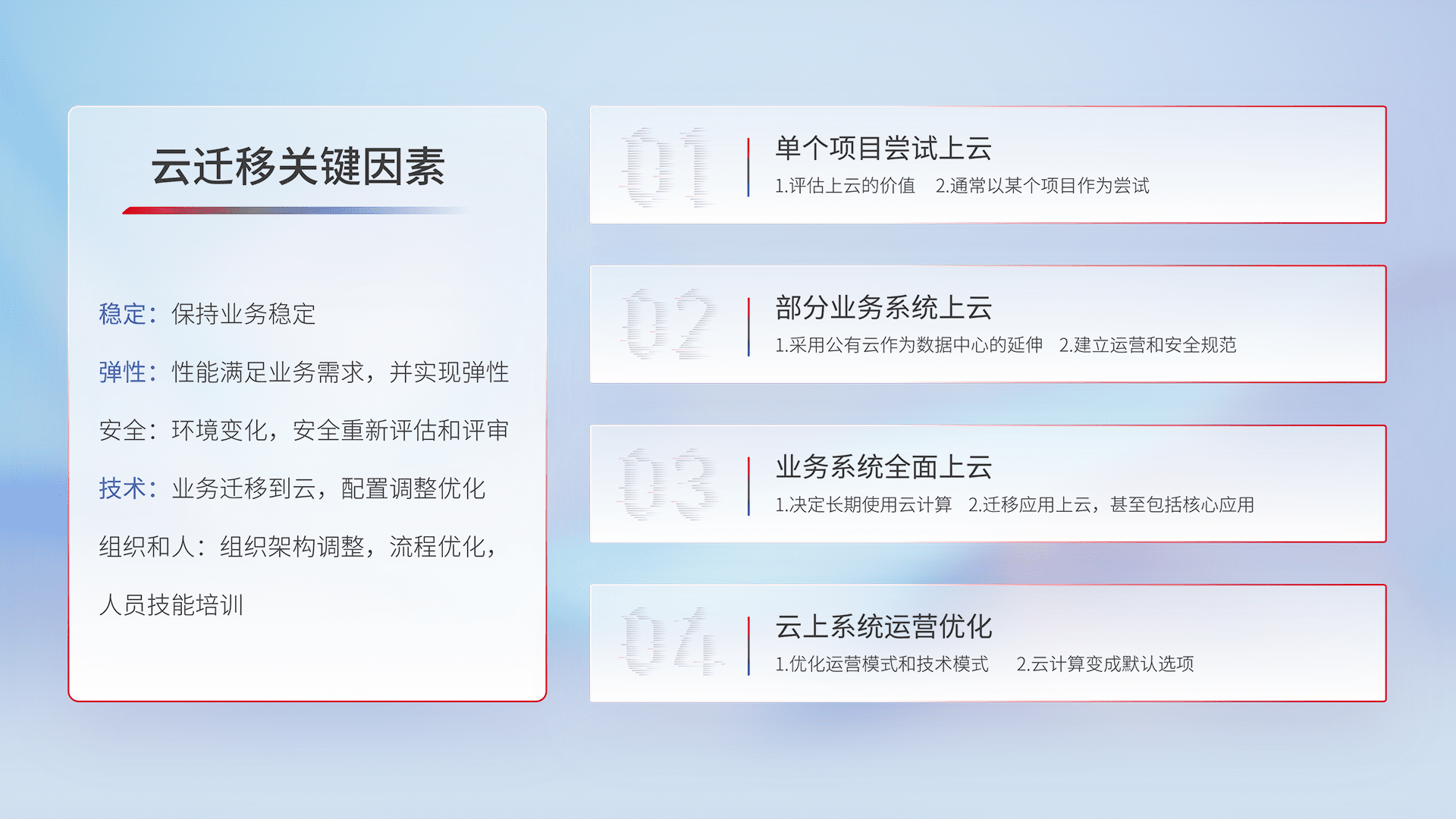 结合实际业务,,,从规划设计、、、、云平台选型、、云原生改造、、、、数据迁移、、、集成交付,,,,迁移全过程为客户识别最佳上云路径,,,,做好风险识别管理,,,,设计网络架构、、、身份权限、、、、安全审计合规、、操作审计、、、、日志审计、、、、监控告警策略、、、、多站点容灾设计等,,对云上基础设施进行整体规划,,,提升IT治理水平,,,以满足弹性、、、、高可用、、、、高性能的需求。。。